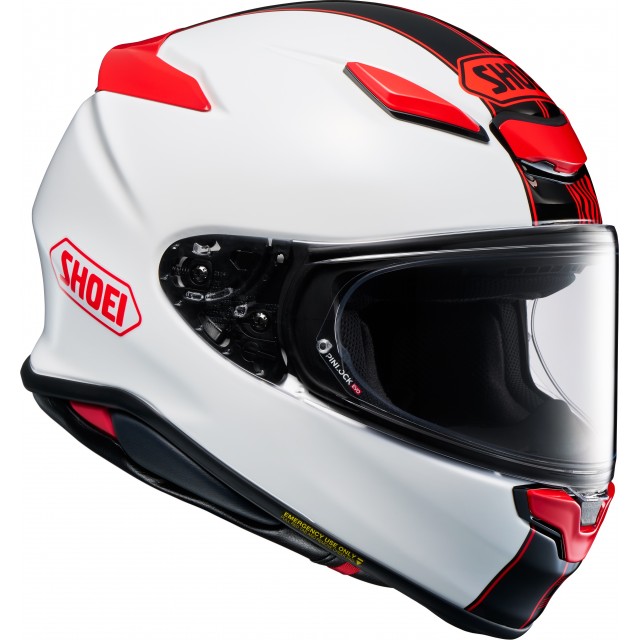 The compact and lightweight SHOEI NXR2 premium sports helmet. Its AIM (Advanced Integrated Matrix) outer shell, combined with a polystyrene core system composed of several elements of different absorption capacity, provides optimum impact protection. The CWR-F2 visor, newly developed for the SHOEI NXR2, with two-dimensional shaping, enables distortion-free and very natural vision. Reinforcements at the upper and lower edge of the visor increase torsional stiffness, and a locking mechanism now located in the center prevents the visor from opening unintentionally. The enlarged, mist-retardant PINLOCK®EVO lens included with the helmet allows a clear view over a large part of the usable field of vision, even in difficult weather conditions, thanks to the mounting pins that are set far to the rear. The chin strap with double-D closure is easily adjustable and holds the helmet safely in place. In an emergency, the cheek pads can be easily removed for gentle helmet removal thanks to the EQRS system (Emergency Quick Release System). The 6 air inlets and 4 air outlets of the SHOEI NXR2 are connected via a branched ventilation system inside the helmet shell and noticeably reduce the temperature and humidity inside the helmet. They always ensure a sufficient supply of fresh air for the rider without increasing the noise level. The integrated spoiler in the back of the head stabilises the helmet at higher speeds.