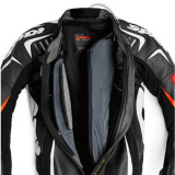 The Spidi experience in Motogp and Superbike has created the perfect mix of performance and design: the Track Wind Replica Evo. Equipped with many technical solutions tested in the MotoGP championship, this suit is made of Italian 1.2 /1.3mm thick bovine leather, combined with stretch material structures and neoprene inserts for absolute comfort. Eight certified protectors (from Multitech, Force Tech and Biomechanic series) can be combined with the Warrior Chest protector and Warrior Back protector, certified level 1 or level 2, to provide the best safety level. The fully racing declination is given by the presence of the fully removable mesh lining: a very important detail to be able to wash and dry the suit very quickly, even after each test session.