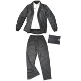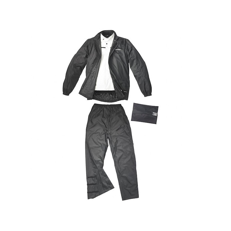 Waterproof split suit, consisting of a jacket, a trouser and a handy bag for carrying it bags, backack or under-saddle compartments.