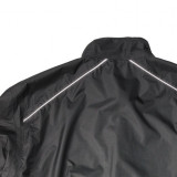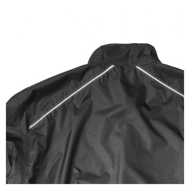 Rain split suit composed of a long jacket with a high collar, two large front pockets, elasticated waist areas and reflective detail on the shoulders. The trousers are characterized by easy fit, elastic waist band, and wide Velcro surfaces for proper calf adjustment.