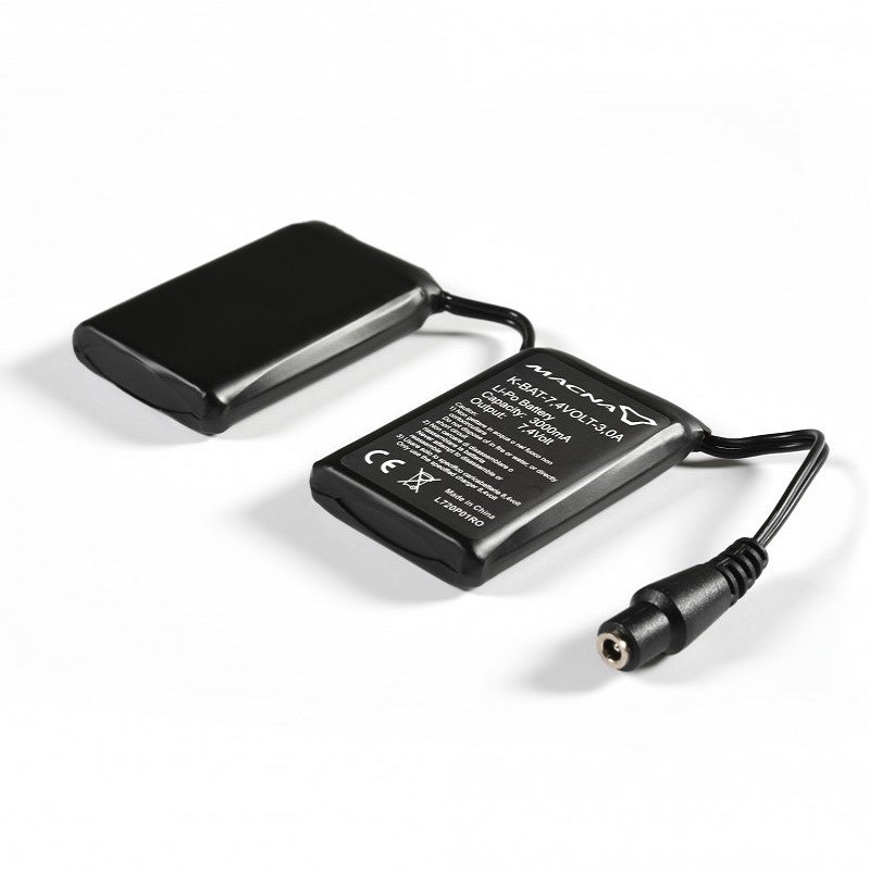 The Kit Batteries Macna 7,4V-3Ah for Heated Clothing is composed of a single kit of two 7.4V 3000mh Li-Po batteries. Useful for powering Klan products, specifically the gloves and heated socks of the DUAL POWER line that can also work with these 7.4V batteries as well as directly connected to the bike's battery. Staying warm even after a winter trip on a motorbike or during winter sports will no longer be a problem, much appreciated for outdoor work or all activities exposed to cold temperatures. This Kit powers a single glove or sock, usually purchased as a spare part or emergency battery pack. 40x60x10 mm dimensions.