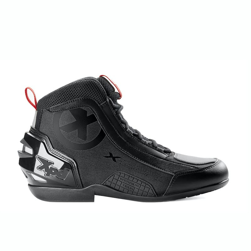 Xpd X-Zero scarpe moto touring estive. Il dorso in mesh traforato garantisce la giusta ventilazione e la suola anatomica assicura un elevato comfort. Il tacco posteriore aiuta la stabilità di guida, andando a bloccare la scarpa sulla pedalina. I rinforzi su tacco, punta e malleoli rendono queste scarpe adatte alla guida stradale su moto touring e naked. La chiusura stringata e i rinforzi shock absorber in poliuretano sui talloni completano le dotazioni di questa scarpa da moto.