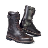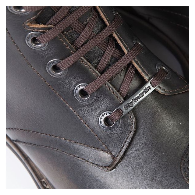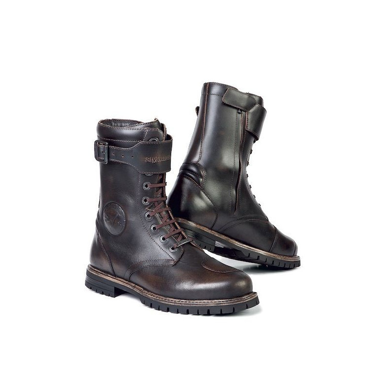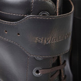 Stylamrtin Rocket sono stivali dallo stile Café Race in pelle pieno fiore scrivente con un particolare trattamento che dona alla pelle un effetto vintage; equipaggiati con fodera interna impermeabile e traspirante, protezioni interne in PU su Malleoli e protezione cambio in pelle tono su tono, gli stivali Rocket sono adatti per affrontare qualsiasi percorso, sia nell'ambito urbano che turistico. La pratica chiusura zip combinata ai lacci e al cinturino gambale regolabile, rendono la calzata sicura e confortevole. Suola in gomma antiolio, antistatica e antiscivolo.